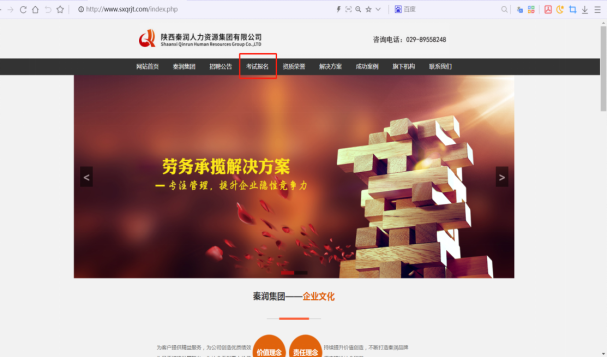 1.登錄陜西秦潤人力資源集團有限公司官網(wǎng)(網(wǎng)址:http://bianpi.cn/),點擊“考試報名”。