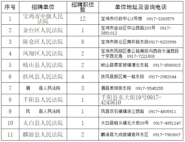 (七)有關(guān)招聘信息將在寶雞市中級(jí)人民法院官網(wǎng)及微信公眾號(hào)上公布,請(qǐng)考生密切留意并及時(shí)查看,如因考生未及時(shí)查看等原因,導(dǎo)致的相應(yīng)后果由本人承擔(dān)。