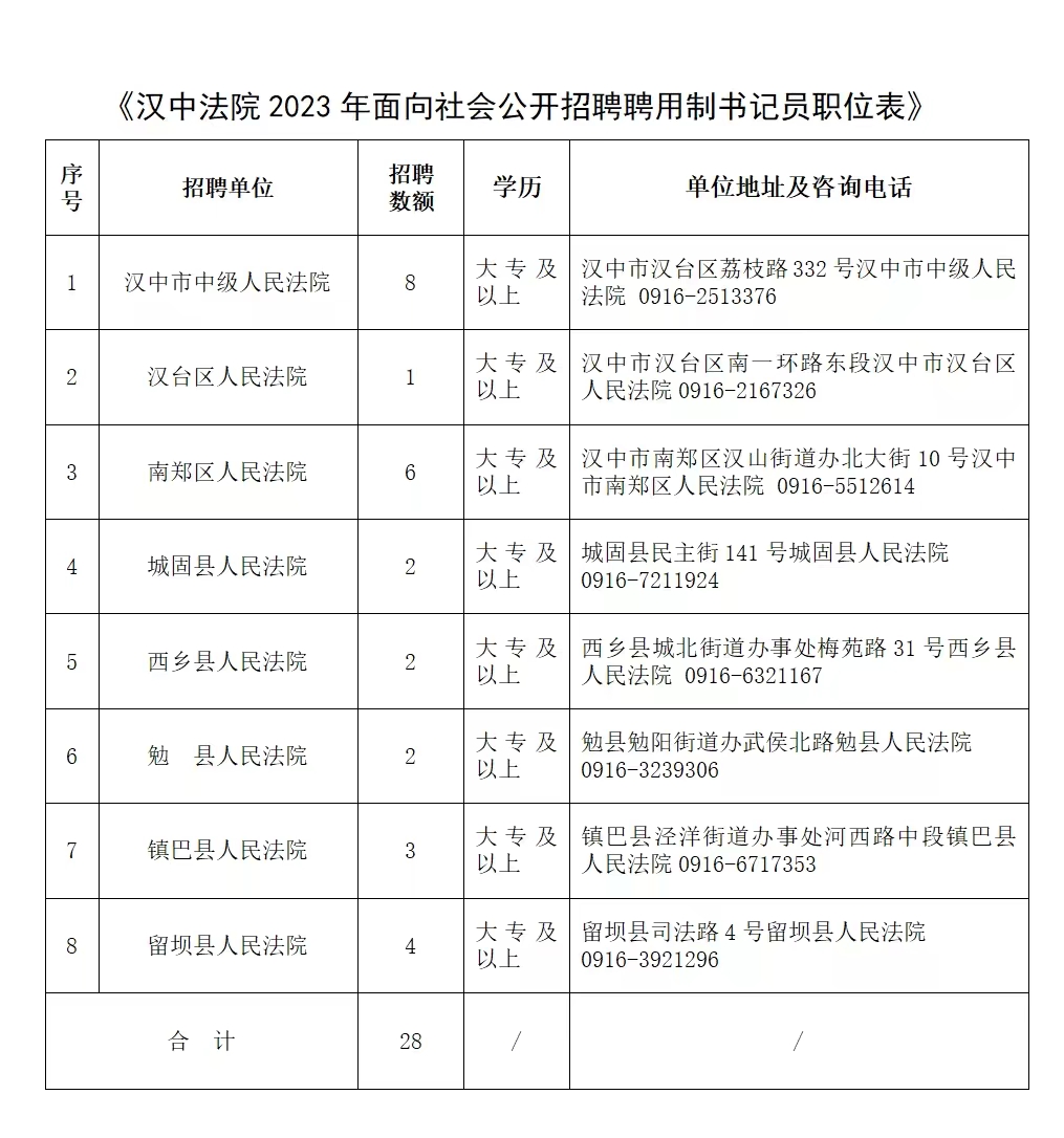 全市法院共招聘聘用制書記員28名,各法院招聘職位、地址及政策咨詢電話詳見(jiàn)《漢中法院2023年面向社會(huì)公開招聘聘用制書記員職位表》(附件)。